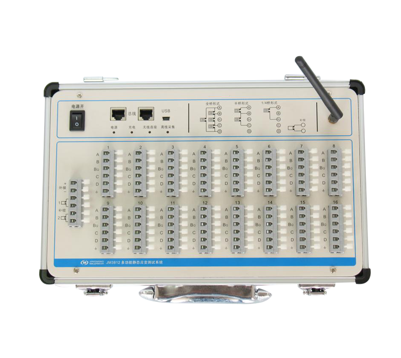 JM3812多功能靜態(tài)應(yīng)變測(cè)試系統(tǒng)每臺(tái)儀器16測(cè)點(diǎn),特別適合測(cè)點(diǎn)分布相對(duì)集中的工程測(cè)試場(chǎng)合。系統(tǒng)支持單臺(tái)USB接口直接聯(lián)接測(cè)試及多臺(tái)之間通過總線級(jí)聯(lián)組網(wǎng)測(cè)試。儀器支持AC220V供電及外接直流電源供電,并且直流供電的范圍很寬,使用十分便捷。儀器內(nèi)置大容量存儲(chǔ)器,可保存數(shù)萬次測(cè)試數(shù)據(jù)。儀器每個(gè)測(cè)點(diǎn)橋路獨(dú)立設(shè)置,每臺(tái)儀器有2個(gè)補(bǔ)償片接入端子,可在軟件中為每個(gè)測(cè)點(diǎn)分別選擇任意補(bǔ)償片,現(xiàn)場(chǎng)測(cè)試方式更加靈活。