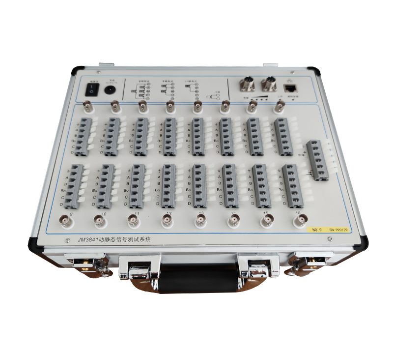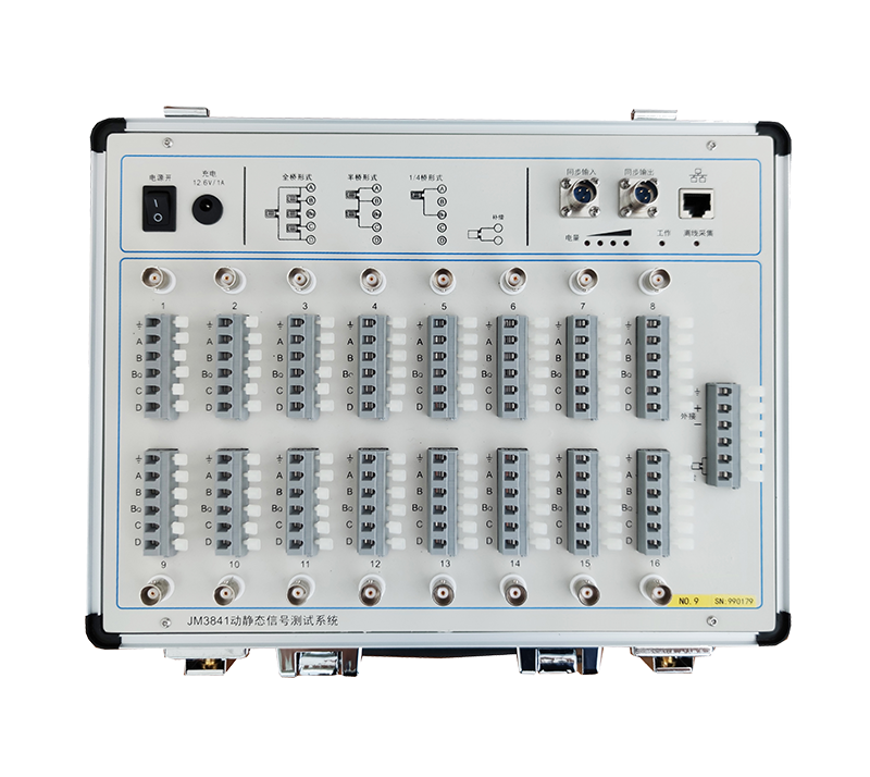 JM3840/JM3841動(dòng)靜態(tài)信號(hào)測(cè)試系統(tǒng)是一款支持靜態(tài)和低速動(dòng)態(tài)應(yīng)變、電壓、IEPE測(cè)試的高性能測(cè)試系統(tǒng),特別適合測(cè)點(diǎn)分布相對(duì)分散的工程測(cè)試場(chǎng)合,所有測(cè)點(diǎn)同步進(jìn)行采集。系統(tǒng)支持以太網(wǎng)組網(wǎng)測(cè)試。儀器內(nèi)置鋰電池工作,也支持外接直流電源(蓄電池)供電,并且直流供電的范圍很寬,使用十分便捷。儀器每個(gè)測(cè)點(diǎn)橋路獨(dú)立設(shè)置,每臺(tái)儀器有一個(gè)補(bǔ)償片接入端子,可在軟件中分別為每個(gè)測(cè)點(diǎn)選擇補(bǔ)償片,現(xiàn)場(chǎng)測(cè)試方式更加靈活。每個(gè)測(cè)點(diǎn)設(shè)有應(yīng)變接線端子和BNC輸入端子,可接應(yīng)變片、拾振器、IEPE型傳感器、各種橋式傳感器,可以測(cè)量應(yīng)力應(yīng)變、加速度、溫度、力等信號(hào),廣泛應(yīng)用于橋梁、建筑的檢測(cè)試驗(yàn)和疲勞試驗(yàn)現(xiàn)場(chǎng)。端子設(shè)置為電壓輸入時(shí)可以直接連接如拾振器的電壓輸出型傳感器,設(shè)置為IEPE時(shí)可以直接配接IEPE傳感器。儀器每個(gè)通道采用獨(dú)立24bits ADC,具有較高的信噪比,保證每個(gè)通道同步采集,多臺(tái)儀器組網(wǎng)時(shí)通過連接同步線也能保證所有通道的同步性。