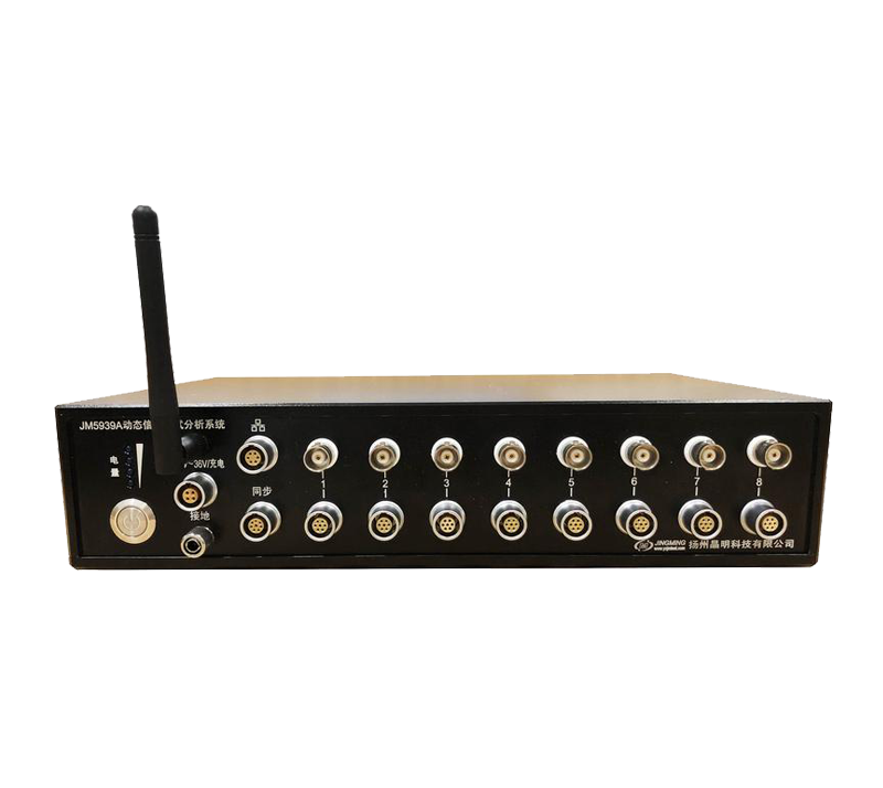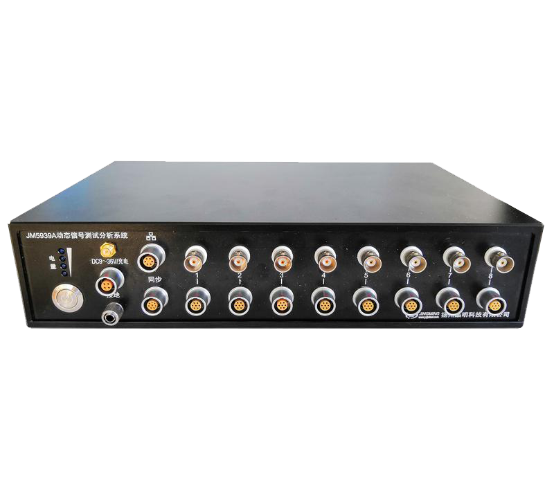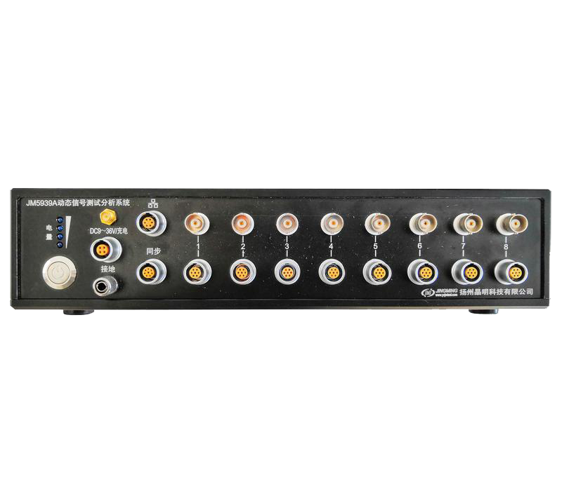 JM5939A是一款高性能集信號調(diào)理及數(shù)據(jù)采集分析的堅(jiān)固型多功能動態(tài)信號測試分析系統(tǒng)。系統(tǒng)采用WiFi網(wǎng)絡(luò)和LAN與計(jì)算機(jī)進(jìn)行通訊,完成信號的調(diào)理和數(shù)據(jù)的采集。單臺設(shè)備支持8CH,系統(tǒng)多支持8臺設(shè)備同時工作,系統(tǒng)支持通過同步器實(shí)現(xiàn)同步工作。每通道內(nèi)置獨(dú)立的24bit ADC,保證每通道以不低于1kHz的采樣率同步采樣,這一性能使系統(tǒng)既適用于一般的信號采集應(yīng)用,也適用于較高要求的如模態(tài)測試等試驗(yàn)場合。